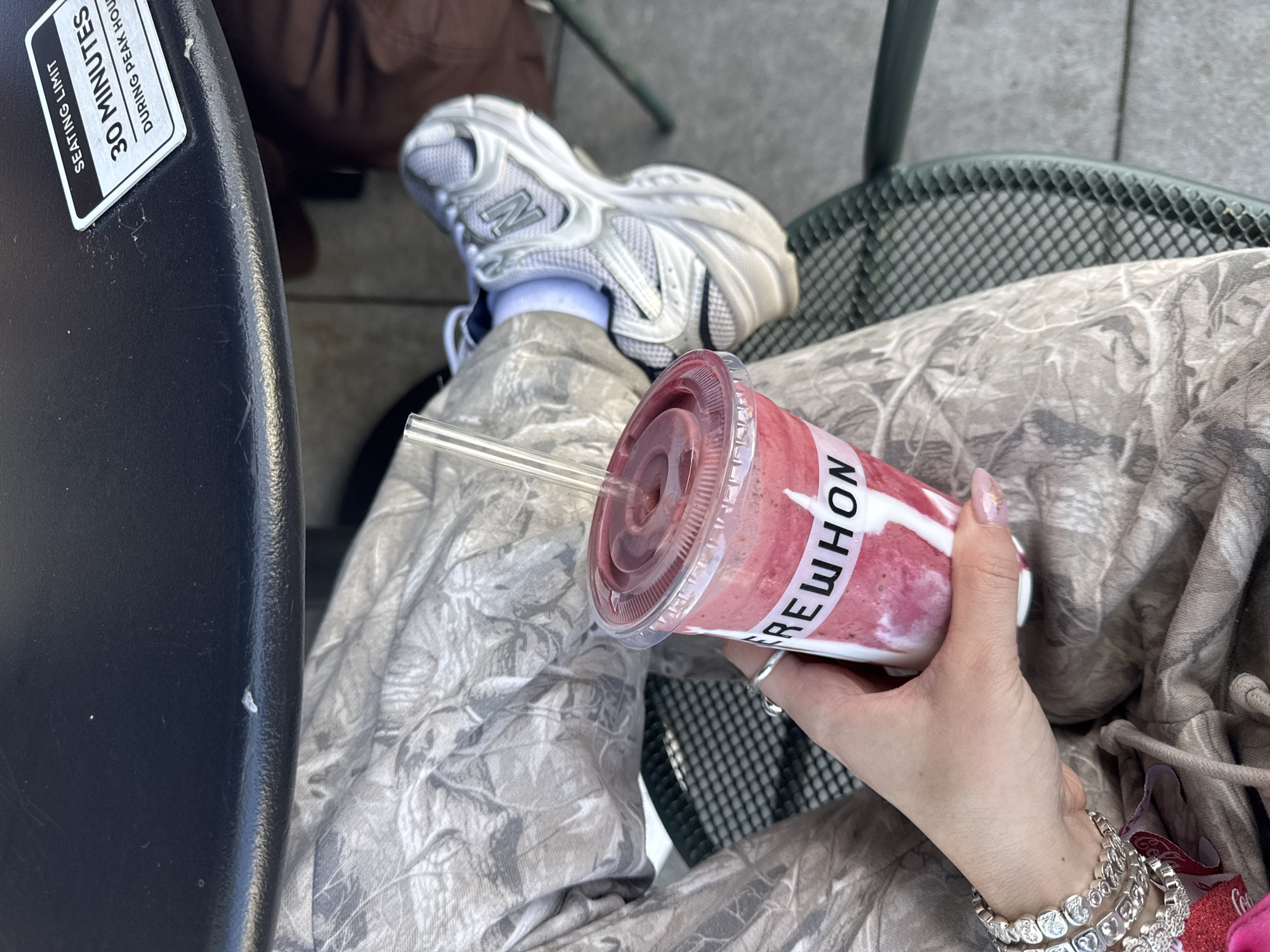 A person is seated outdoors at a black metal patio table and chair in Beverly Hills, United States of America. The person is wearing silver and white New Balance sneakers and patterned grey and white pants. They are holding a Rewhom brand pink and white smoothie in a clear plastic cup with a clear straw. The person is wearing multiple silver bracelets. The table next to them has a sign that says "Seating Limit 30 Minutes During Peak Hours".