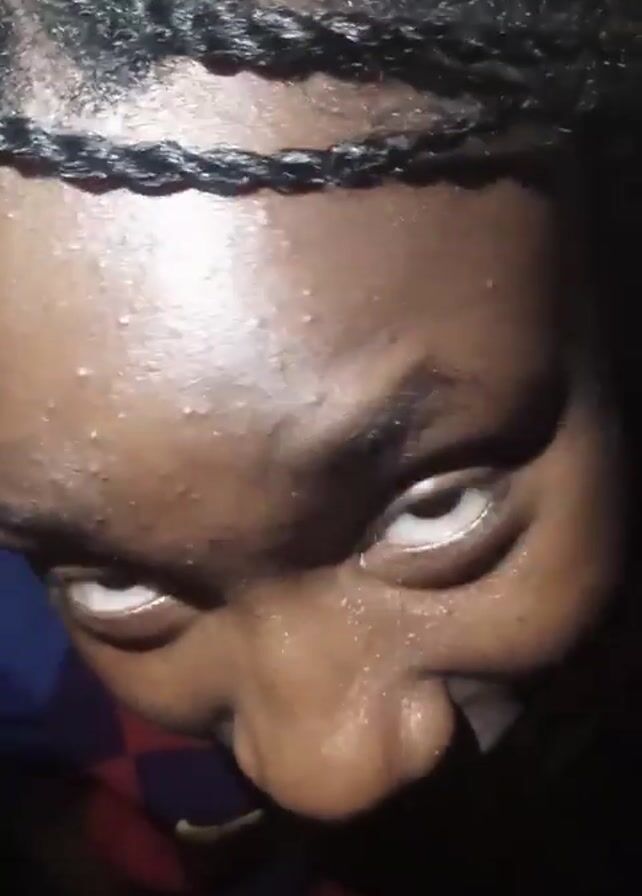 A close-up, top-down shot shows a person with dark skin and short, dark hair styled with a braid along the hairline. Their eyes are open and slightly wide, and they are smiling slightly. The lighting is dim, casting shadows on their face. The person is wearing a shirt with a red and blue pattern.