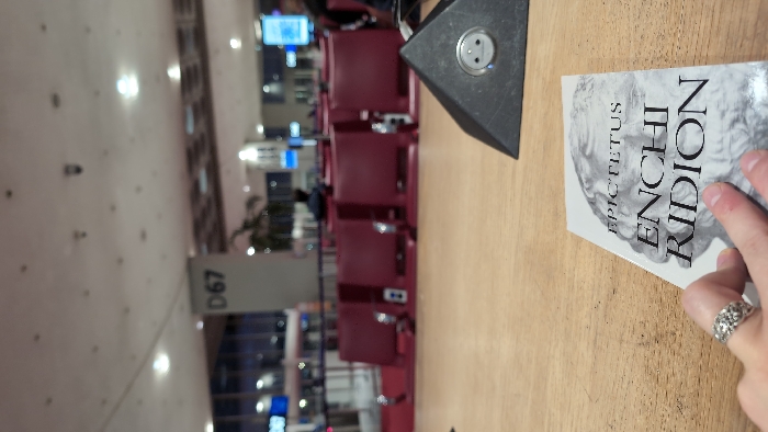 copy of Epictetus' "Enchiridion" on a light-colored wooden surface. Adjacent to the book is a triangular charging station. In the background, rows of red chairs are visible in a blurred airport terminal setting. Sign D67 is also visible in the background. A hand with a silver ring holds the book in place on the right side of the frame. The overall scene conveys a moment of reading during travel.