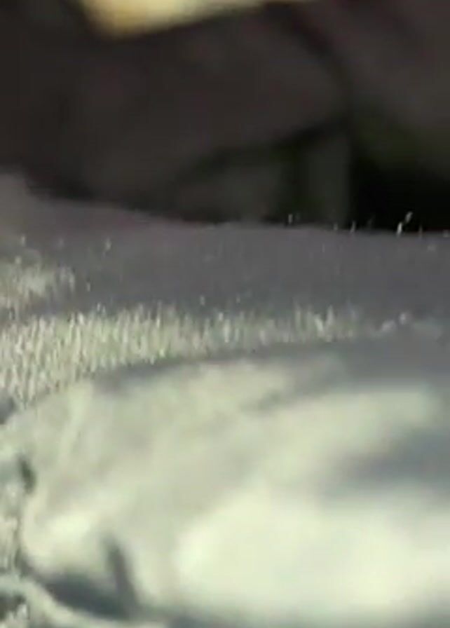A short, close-up video shows a tabby cat emerging from a black jacket