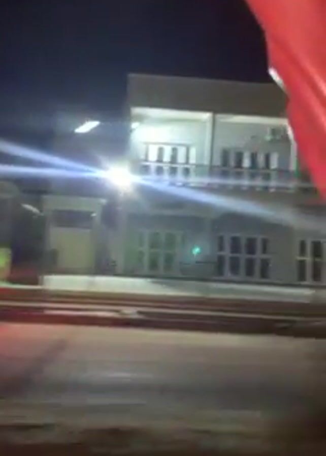 nighttime street scene with a two-story building on the right side of the frame, featuring lighted signs for various businesses. Cars and a yellow tricycle taxi pass by on the street. A blurred red object is in the foreground on the right, partially obscuring the view. The environment appears to be a commercial area at night, with streetlights providing illumination.