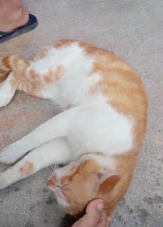An eye-level shot shows a light orange and white cat sleeping on a gray concrete surface with its head resting against a person's foot. The person, wearing blue printed pants, gently touches the cat’s head with their foot. Another person wearing black flip-flops stands nearby. The cat remains still and appears undisturbed by the touch. The environment is simple, with only the concrete surface and the people visible.