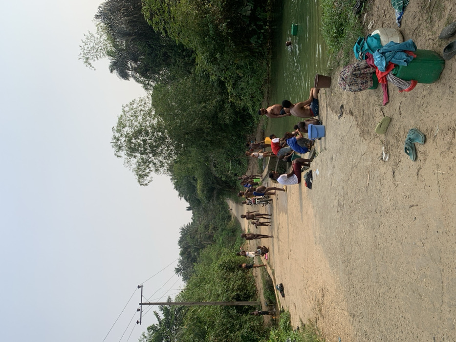 - "The image depicts an outdoor scene in Ikot Obio Ata, Nigeria, focusing on a dirt road running through dense, tropical vegetation and a communal bathing area beside a stream" by FM-3kfkr1, licensed under CC BY 4.0