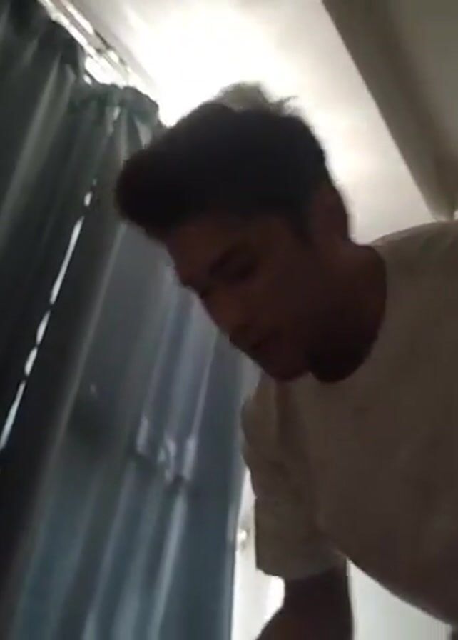 Here's a concise description of the scene: The video shows a young man with short, dark hair wearing a white t-shirt with a graphic on the sleeve. He's initially leaning forward, speaking, and then straightens up and walks towards the other side of the room. The environment appears to be a small, somewhat cluttered room with a curtain to the left, an air conditioner mounted high on the wall, and various items hanging on the wall. There's also another person partially visible in the lower left corner of the frame. The overall lighting is somewhat dim.