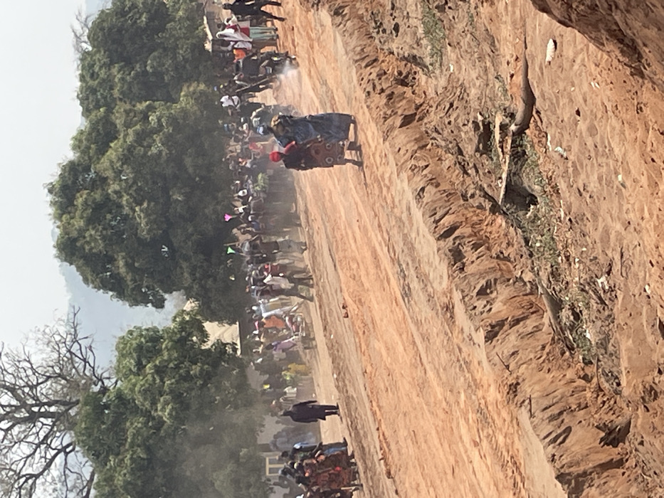 A dirt road lined with trees and a crowd of people. Two figures, one in red and one in blue, appear to be carried down the road, possibly in a procession. Spectators line both sides of the path. Dust or smoke fills the air. On the right, a steep, eroded bank rises beside the road. The image is angled, giving a skewed perspective.