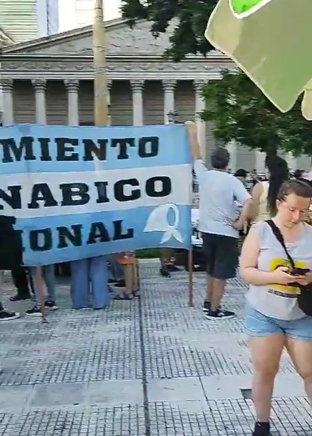 crowd of people gathered in a city square, standing around a blue and white banner that reads "MOVIMIENTO CANNABICO NACIONAL"