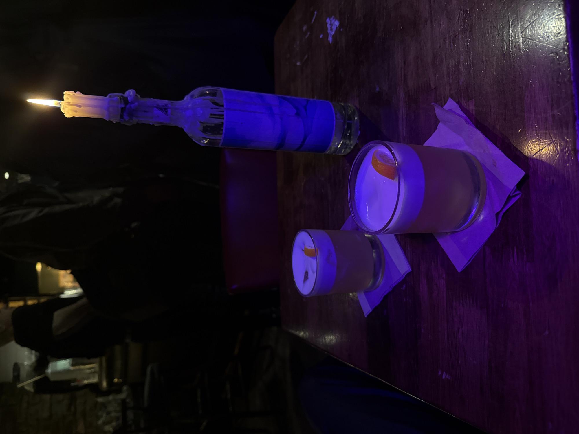 dimly lit bar scene in the City of Edinburgh, United Kingdom. On a wooden table, there is a bottle converted into a candle holder with a lit candle. Two glasses containing cocktails, likely sours, are on napkins beside the bottle. The cocktails have a white foamy top and a garnish of citrus peel. The bar is dark with a background of shadowy figures and blurred interior.