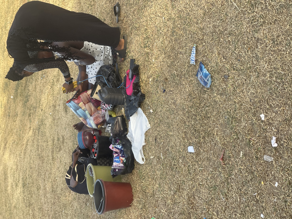 The image depicts an outdoor scene in an unidentified open, grassy area within the city of Abuja, Nigeria, characterized by dry, sparse grass and scattered litter. Three individuals are visible among numerous personal items and merchandise spread on the ground. In the center-right, a female subject stands bent over, facing another seated female. The standing subject wears a long, dark, possibly black, dress with long sleeves featuring small, reflective embellishments, and dark braided hair. Her feet are shod in dark slide sandals, with one dark flip-flop visible on the ground near her left foot. She is holding a yellow-cased mobile phone, seemingly interacting with it or assisting the seated subject. The seated female subject, positioned below the standing individual, wears a white garment with black polka dots. She is also holding a mobile phone and appears to be actively using it. A blue charging cable is visible near her. To the far left, a third subject is partially visible, seated or reclining amongst a collection of items. This individual wears a dark top with light trim, and bare feet are visible. A significant array of objects is arranged on the ground. These include: * A large red plastic bucket. * A large lime green plastic bucket. * A black bucket containing several small red-capped bottles, possibly beverages or cosmetics. * A black plastic jerrycan-like container. * Multiple black plastic bags, one of which contains packaged snacks and candies. * A white plastic shopping bag. * A patterned multicolored tote bag. * A dark bag with a light-colored monogram, possibly an imitation designer item. * A small pink hairdryer. * Various other small packaged goods and personal items. The ground around the subjects and objects is littered with small pieces of debris, including plastic wrappers and scraps of paper. The overall lighting suggests daylight, with warm tones.