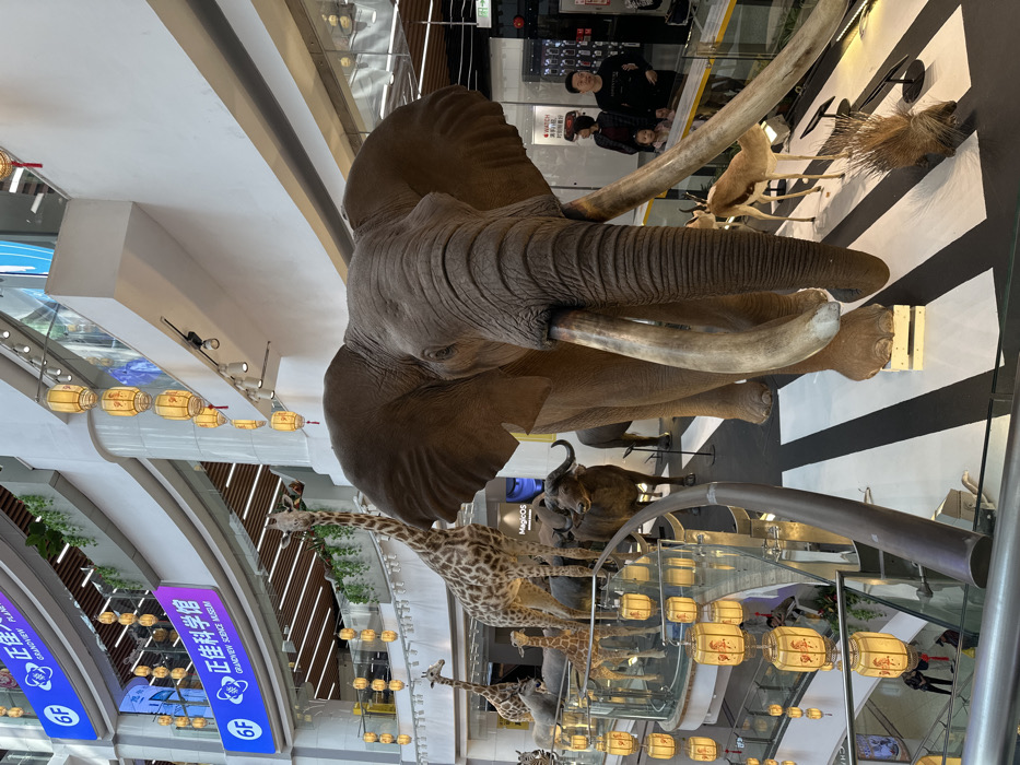 An elephant head and tusk statue dominates the scene, accompanied by mounted animal displays, including giraffes and antelopes. Below, Chinese lanterns are visible along the interior of the building, which features multiple levels and large signage. The location seems to be a museum or grand exhibition space. People are standing and observing the exhibits in the background. The scene is captured from a high-angle perspective.