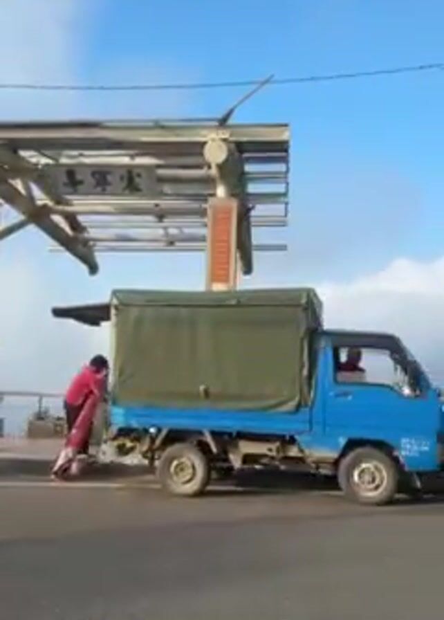 blue truck driving past an archway in front of a scenic overlook. A person in a red shirt is seen standing near the archway, seemingly cleaning or tending to the area. The truck has a covered bed and appears to be a small utility vehicle. The background features a clear blue sky with some clouds. Power lines and telephone poles are visible along the road. The archway has Chinese characters on its pillars. The overall setting suggests a rural or scenic location with a roadside viewpoint.