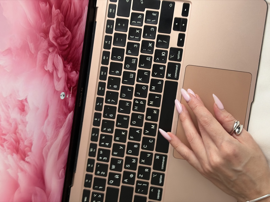 An overhead view of a rose gold MacBook Air laptop in Novosaratovka, Russia, shows the device powered on and displaying a pink, cloud-like wallpaper on its screen. The screen also presents the login prompt with a "Ru" icon and the text "Touch ID или пароль" (Touch ID or password). A female hand, adorned with light pink, pointed fingernails and a silver-colored, multi-band ring on the ring finger, rests on the laptop's trackpad. A partial view of a silver-colored bracelet is visible on the wrist. The laptop's black keys feature both Latin and Cyrillic characters. The device is situated on a light-colored, soft surface.