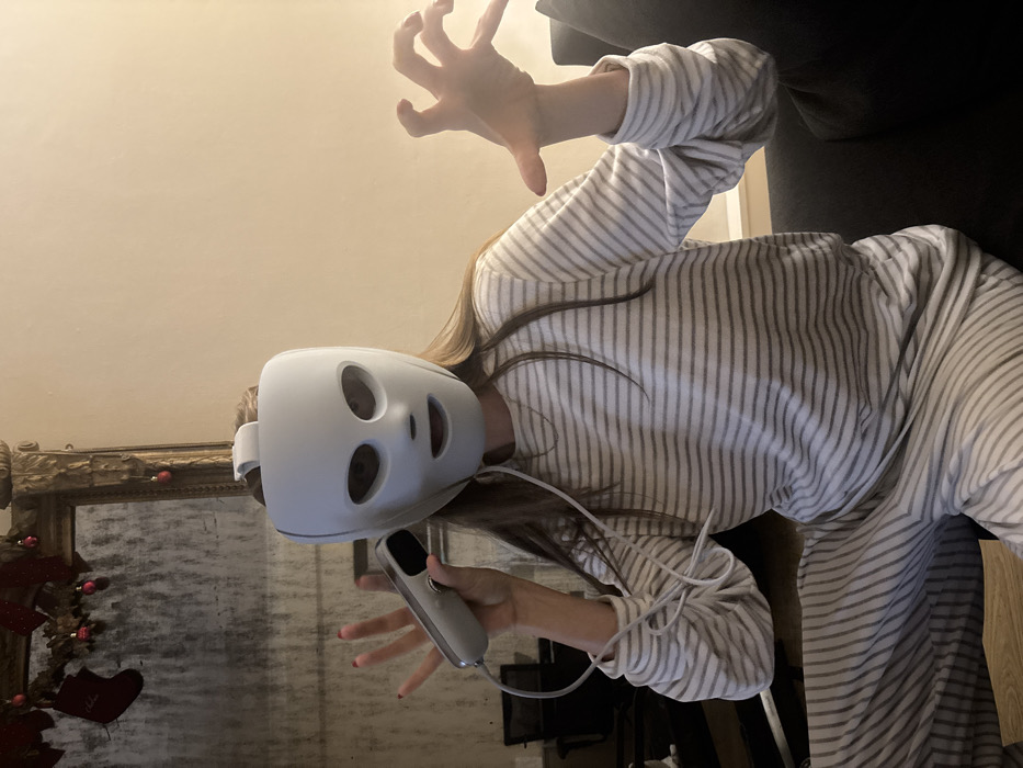 - "A person wearing a white LED face mask and matching pajamas with gray stripes poses with their hands raised like claws" by FM-Wt2QG3, licensed under CC BY 4.0
