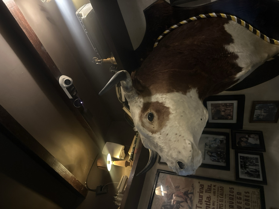 mounted bull head, with brown and white fur, prominently displayed on a wall adorned with framed pictures. Below the head, a poster labeled "Taurina" is partially visible, mentioning "Tlax" and "El Callao," suggesting a connection to bullfighting. A small lamp illuminates the area, while a modern security camera is mounted on the wall, creating a contrast between traditional decor and modern technology.