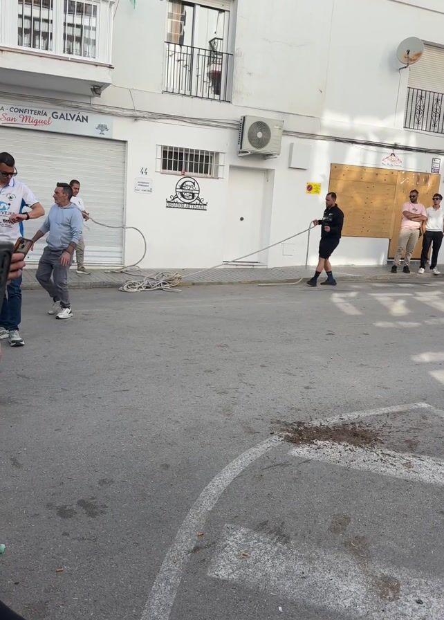 A street scene shows a group of people gathered near a building with white walls and bunting overhead. A person in black, wearing dark clothing, is seen walking, bending over and appearing to pick something up. Several people in white shirts and dark pants stand around watching. The street is made of asphalt and has faded white lines painted on it. An air conditioning unit is visible on the side of the building.