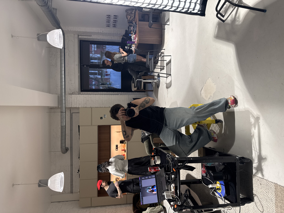 A bright, high-ceilinged room features a photographer taking pictures. Two models stand near a window. Below the photographer, two individuals huddle around a cart with a laptop displaying a photo. The photographer, wearing jeans and a black top, stands on a yellow platform with wheels. Lighting equipment hangs from the ceiling. The room appears to be a studio space with minimalist décor and exposed brick walls.