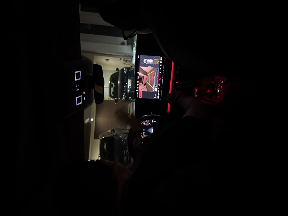 Inside a vehicle at night, a central display shows a rear camera view with parking guidelines. Illuminated buttons and a rearview mirror are visible. Outside, a dark-colored SUV and garage entrance can be seen. The steering wheel and dashboard are partially illuminated, with the driver's hands present. The environment is very dark, with most details obscured.