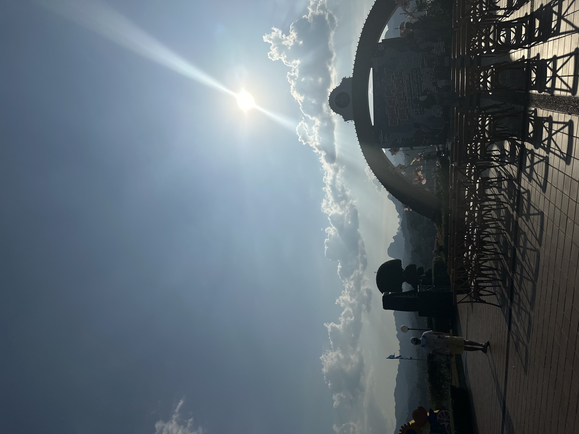 bright, sunlit scene taken at a park in Khao Phang, Thailand. The sun shines brightly from the sky above partially obscuring clouds. A large circular structure is visible with rows of empty chairs in the foreground and an individual wearing a light-colored shirt and yellow shorts walking along a paved walkway nearby. The background contains greenery, topiary, and mountains.