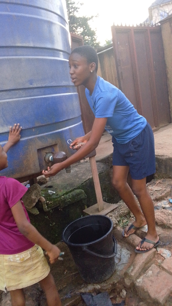 The scene depicts an outdoor water collection point in Obosi, Nigeria