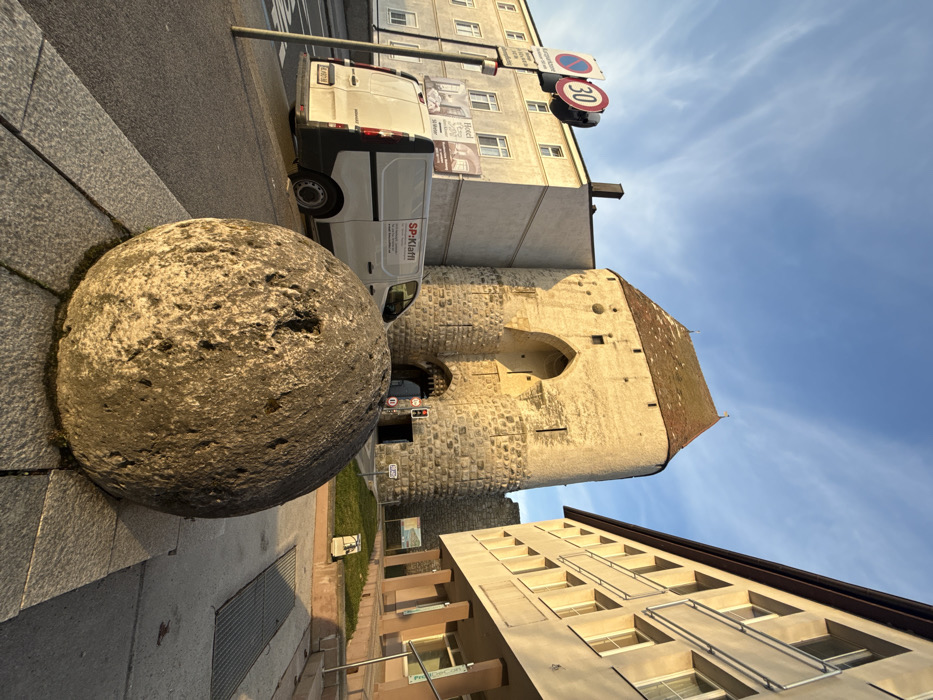 The image depicts a street-level scene in Hainburg an der Donau, Austria, with the Wiener Tor (Vienna Gate) as a central feature. In the immediate foreground, a large, dark, textured spherical stone object rests on a light gray paved sidewalk. To the left of the stone, a paved street runs diagonally into the midground. A white commercial van, with "SP:Klaffl" branding visible on its side, is parked parallel to the curb, facing away from the viewer. Behind the van, a pole displays two street signs: a circular red-and-white "No Stopping" sign and a red-bordered "30" speed limit sign. A pedestrian crossing is faintly visible on the street surface near the van's rear. In the midground and background, the imposing Wiener Tor, a historic stone gate structure with an arched entrance and a conical tiled roof, stands prominently. The gate is constructed from large, irregular stone blocks at its base and lighter, more uniform stones in its upper sections. A red traffic light is visible within the arched passageway. To the left of the gate, a multi-story building with a light beige facade and numerous windows is visible. A partially obscured banner or sign on this building suggests it might be a "Hotel." To the right of the gate, another multi-story building with a light facade features rows of windows and recessed balconies, with a set of outdoor stairs leading up to its entrance area. Green shrubbery is visible on a small landscaped section near these stairs. The sky above is clear blue with sparse, wispy white clouds. The scene is illuminated by natural light, suggesting either early morning or late afternoon, with sunlight casting warm tones on the buildings and creating some shadows. No individuals are visible.