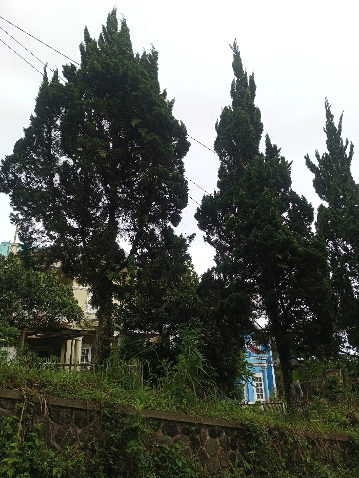 Tall, dark green coniferous trees dominate the scene under an overcast sky. The trees stand in front of buildings, one with a white façade and the other painted blue. A stone wall with thick vegetation growing on and around it forms the foreground. Power lines stretch across the sky above the trees. The setting appears to be a residential area with overgrown plant life.