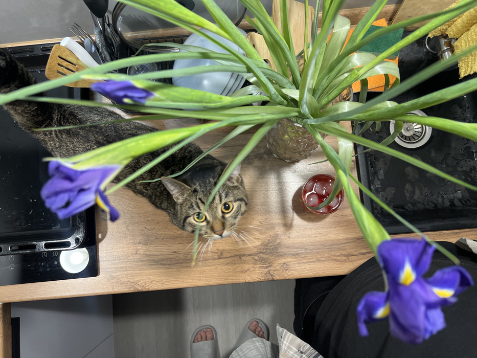A high-angle photograph depicts a domestic kitchen scene in Simferopol, Ukraine. A brown tabby cat with prominent stripes and large yellow-green eyes is positioned on a wood-grain laminate countertop, looking directly upward toward the camera with its head slightly tilted. To the lower left, the feet of a person, clad in light grey slip-on sandals, are visible on a light-colored floor, alongside a portion of a black pant leg. The countertop also features a small clear glass containing a red liquid with multiple ice cubes, and an adjacent clear, textured decorative glass object. A tall plant, identified as irises, with long green leaves and several vibrant purple blossoms with yellow centers, stands prominently in the mid-ground, partially obscuring other kitchen items. In the upper-left, a section of a black induction cooktop with illuminated controls is visible. To the right, behind the plant, a dark kitchen sink with a metal drain is present. Various kitchen utensils, including a wooden spatula and a whisk, are seen in a container near the sink, alongside a light blue bowl. A bright orange sponge and a yellow dishcloth are also visible in the vicinity of the sink basin. The scene is well-lit, indicating an indoor domestic setting.