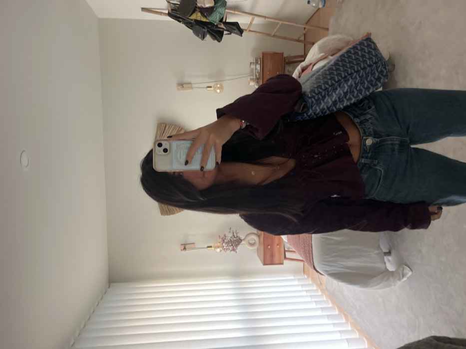 An indoor residential setting, likely a bedroom, within the city of Lordelo do Ouro e Massarelos, Portugal, is depicted. A female individual stands in the foreground, facing her reflection in a mirror to take a selfie. Her face is largely obscured by a light-colored smartphone with a visible card in its case, held by her left hand. She has long, dark hair and wears a dark maroon V-neck long-sleeved top with a front lacing detail, blue denim jeans, and a gold-colored pendant necklace. A blue tote bag with a repeating geometric pattern hangs from her right arm. The background shows a brightly lit room with a light gray carpet and off-white walls. To the left, white vertical window blinds are visible. A bed with white bedding and a rust-colored throw is centrally positioned. Flanking the bed are two wooden nightstands with drawers, each supporting a wall-mounted wooden light fixture featuring a bare incandescent bulb. The left nightstand displays a light-colored, ring-shaped vase containing dried pink floral elements. Above the bed, a decorative wall piece made of natural fibers is mounted. To the far right, a wooden ladder-style shelf leans against the wall, holding several small handbags of various designs. A clear water bottle rests on the floor near the ladder shelf. A single recessed light fixture is visible on the white ceiling.