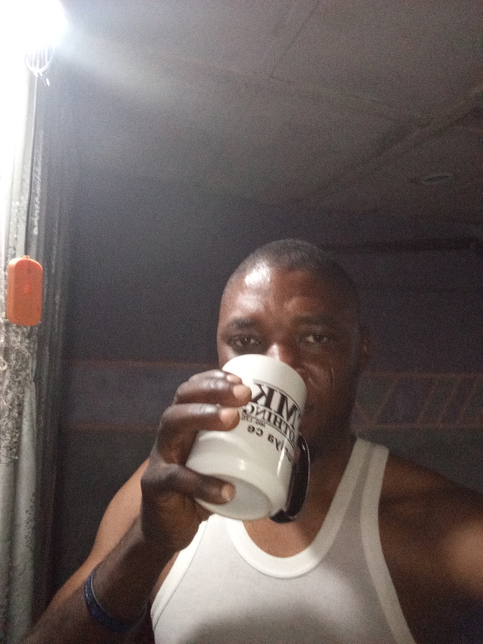 A man holds a white mug with black text, drinking from it. He wears a white tank top and a dark bracelet on his left wrist. The scene appears dimly lit, possibly indoors. A light fixture hangs near the upper left corner. The background is dark, with faint vertical lines suggesting a wall or covering. The man is centered in the frame, focused on the mug.