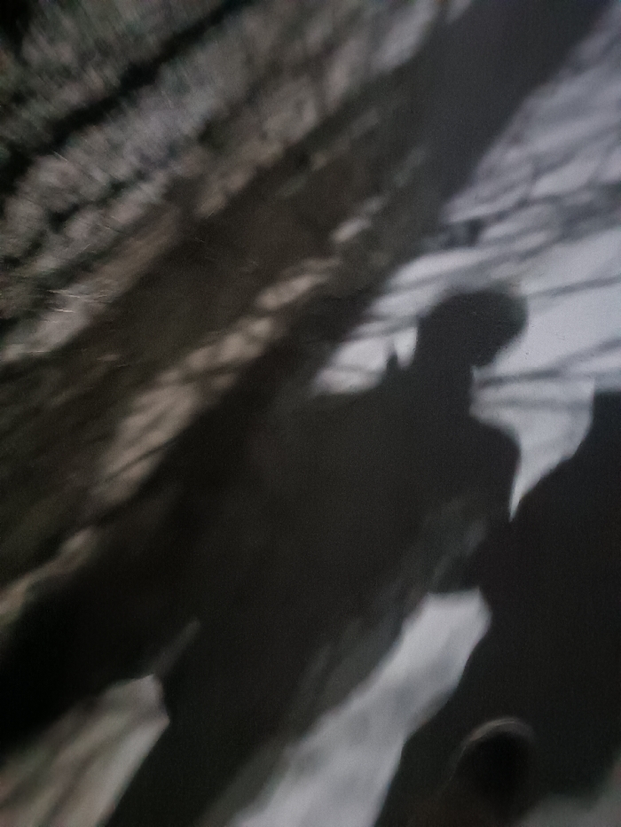 grainy, shadowed scene. Silhouettes of two figures are visible, one seemingly taller than the other. The background features an indistinct, textured surface that suggests tree bark or a similar rough material. Light and dark interplay, obscuring details and creating an abstract feel. The composition focuses on the shapes formed by the shadows, rather than clear, defined objects.