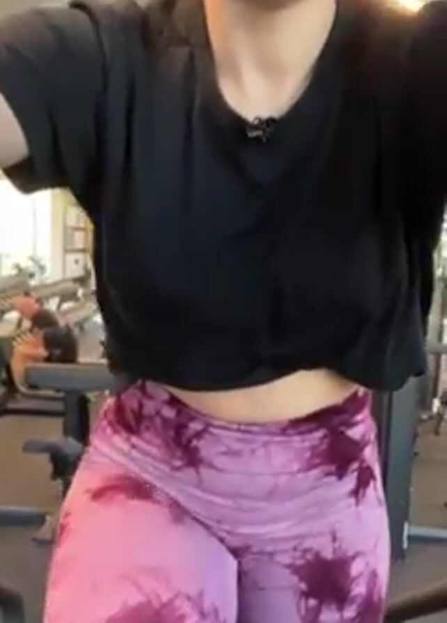 A woman wearing pink and maroon tie-dye leggings and a black crop top is standing on a treadmill at a gym. She is facing the camera, which is held at chest level. The gym equipment is visible in the background. The woman has a microphone clipped to her shirt. She is moving slightly as the treadmill is active.