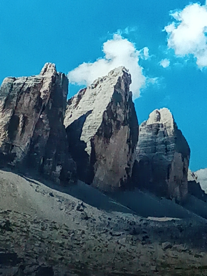 - "Three rocky peaks rise from a gravelly slope, their jagged forms contrasting with the bright blue sky dotted with fluffy white clouds" by FM-GeBdt2, licensed under CC BY 4.0