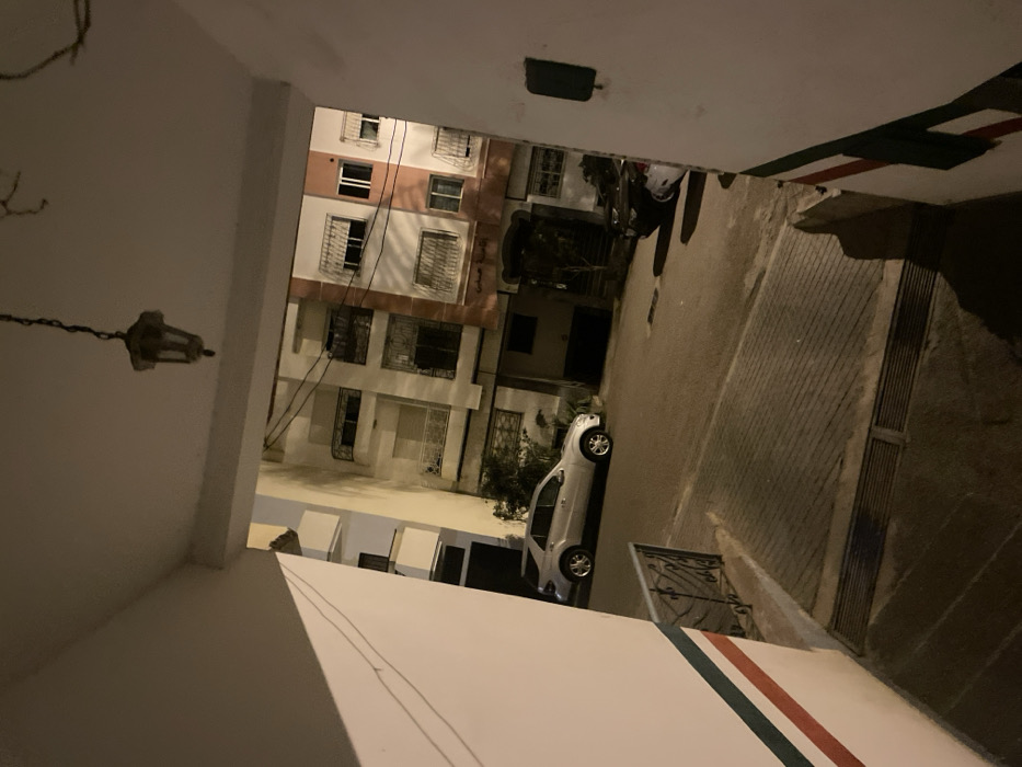 The image depicts a nighttime urban street scene in Casablanca, Morocco, viewed from within an illuminated archway. In the immediate foreground, a traditional-style metal lantern hangs from the white ceiling. The interior walls of the archway, to the left and right, are white with horizontal stripes of green, white, and red. The paved ground within the archway features a metal drainage grate. The view extends into a narrow, paved street or alleyway. On the left side of the street, a silver Mercedes-Benz SUV, possibly an ML-Class, is parked facing right. Further down the street on the right, a dark-colored sedan is partially visible, parked near a building entrance. Across the street, the primary subject is a multi-story residential building with a light-colored facade, featuring sections painted in a faint reddish-pink hue. The building has multiple balconies with white or dark metal railings and numerous windows, some of which are fitted with external security bars or shutters. Above a central ground-floor entrance, Arabic text is visible, reading "اقامة صباح" (Iqamat Sabah), indicating "Sabah Residence." Utility lines crisscross overhead between the buildings. Sparse dark vegetation is present near the base of the buildings. No individuals are visible, and no active events are occurring. The scene is illuminated by artificial light sources, casting shadows and highlighting architectural details.