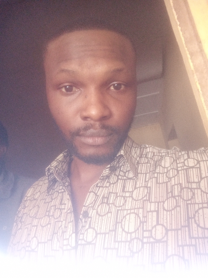 A close-up portrait reveals a man with a dark complexion, short hair, and a neatly trimmed beard. He's wearing a patterned shirt with a visible collar and a button. The background is dimly lit, suggesting an indoor setting. To the left, a blurry figure is partially visible. Overall, the image composition focuses on the man's face, capturing his direct gaze.
