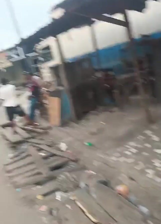 The video depicts a street scene in what appears to be a busy urban area. Initially, the camera focuses on a messy patch of ground with debris and wooden planks under a makeshift shelter. The camera then pans to reveal a street with two men standing on wooden planks in the road. In the background, a large truck is parked along the roadside. As the camera continues to pan, other vehicles, including a blue and white auto rickshaw (tuk-tuk), a silver sedan, and a white minivan are seen navigating the street. The rickshaw passes in front of the camera with a person in the driver's seat. Pedestrians can also be seen walking along the sidewalks. Buildings line the street, and power lines are visible overhead. The overall impression is that of a bustling, somewhat congested urban environment.
