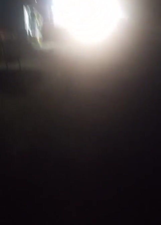 very dark outdoor scene. A bright light source is visible, likely a streetlight or vehicle headlights, creating a strong glare. To the left of the light, the vague outline of a small structure, possibly a shop or stall, can be seen. A person wearing yellow boots is standing near the structure. The rest of the scene is obscured by darkness.