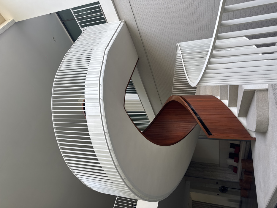 The scene depicts a multi-level architectural interior or semi-enclosed space, likely a lobby or atrium, in Nong Pa Khrang, Thailand. A prominent, modern spiral staircase dominates the composition, ascending from the foreground towards the upper levels. The staircase features light gray, possibly terrazzo or concrete, steps. Its outer railing consists of slender, white vertical balusters and a matching horizontal top rail. The inner core of the spiral staircase is clad in dark reddish-brown wooden planks, forming a solid, curved balustrade. On the ground floor to the left, a recessed lounge area is visible with a long, light-colored built-in bench adorned with red and black throw pillows. Several low, dark brown, cylindrical wooden tables or stools are arranged in front of the seating. A black standing fan is positioned in the background near this area. The wall immediately to the right of the staircase is composed of light gray, horizontally laid bricks or blocks. The ceilings are high and light gray/white, with some recessed lighting fixtures visible on the upper level. The upper floors feature smooth white walls and windows with dark frames, behind white balusters matching those of the main staircase. No individuals are present in the scene. The lighting is bright and even, suggesting natural light penetration.
