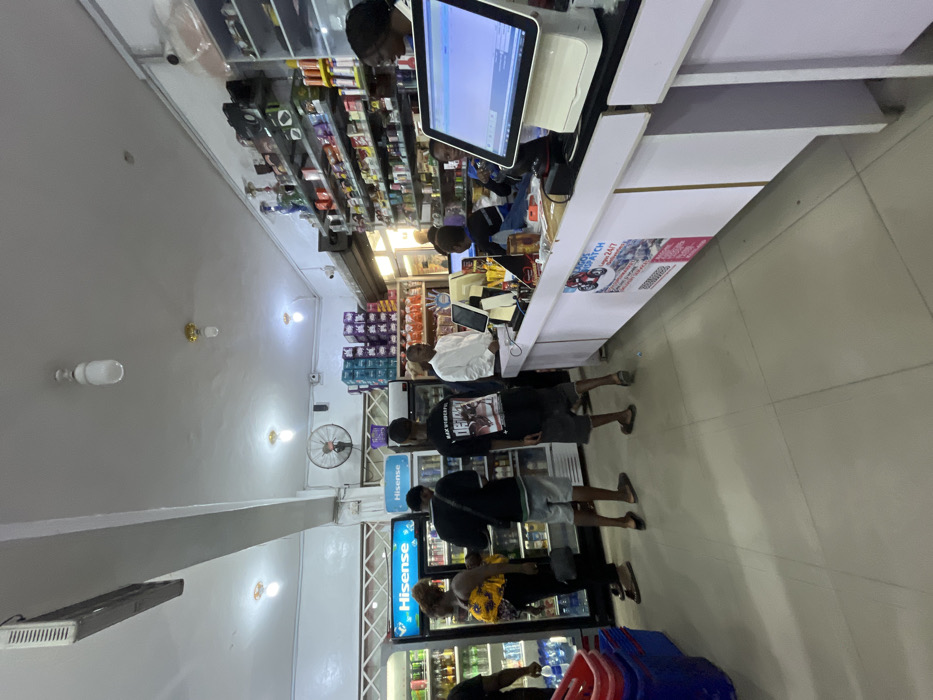 Inside a brightly lit store, a line of people queue at the checkout counter. Shelves stocked with products are visible along the left wall. A large cooler with a "Hisense" logo stands near the end of the line, holding beverages. A ceiling fan is mounted near the cooler. The cashier is at the counter, assisting a customer, and a touch screen monitor is placed.