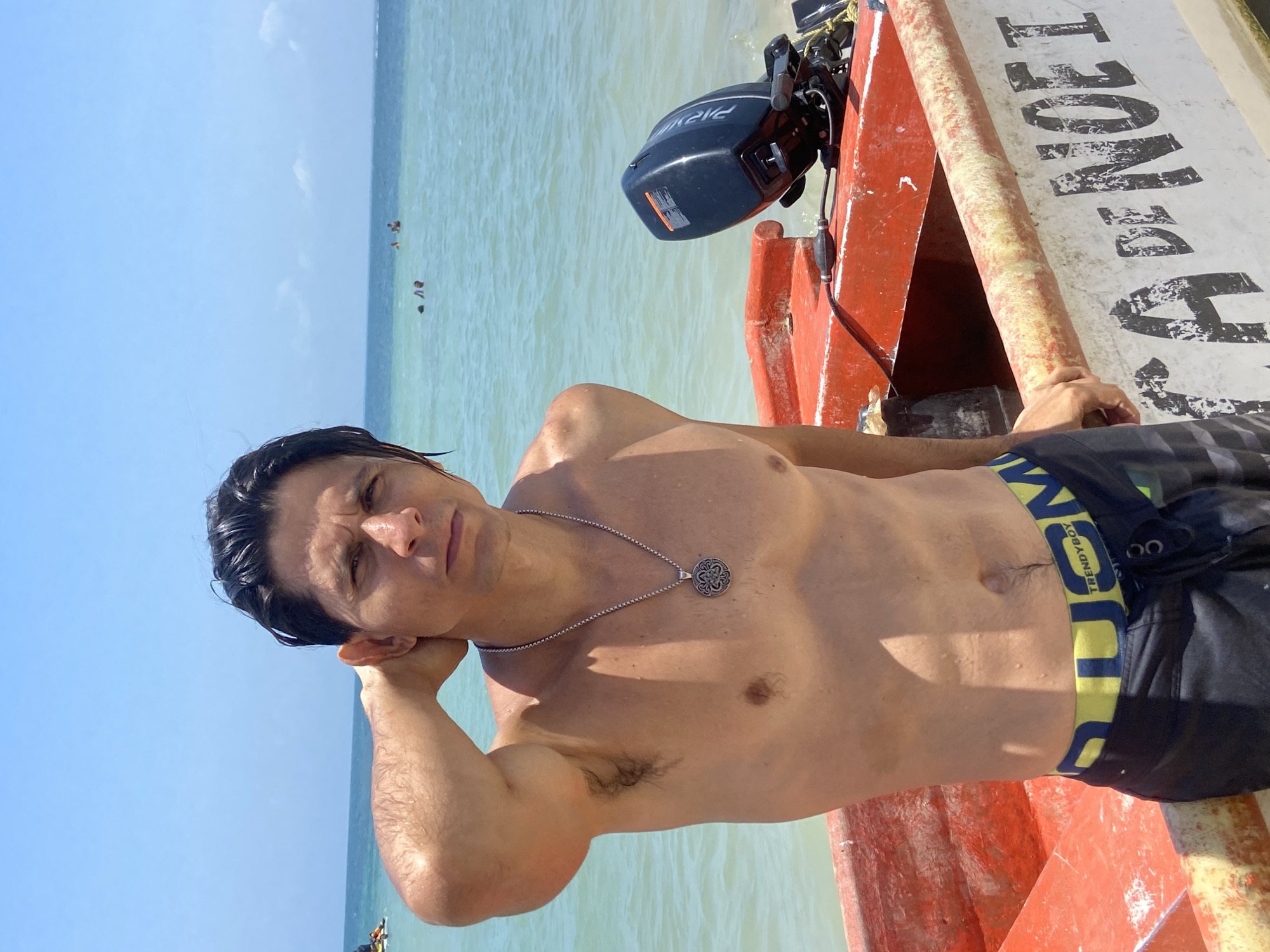 A shirtless man with dark hair and a silver necklace is in a small, red and white boat with an outboard motor