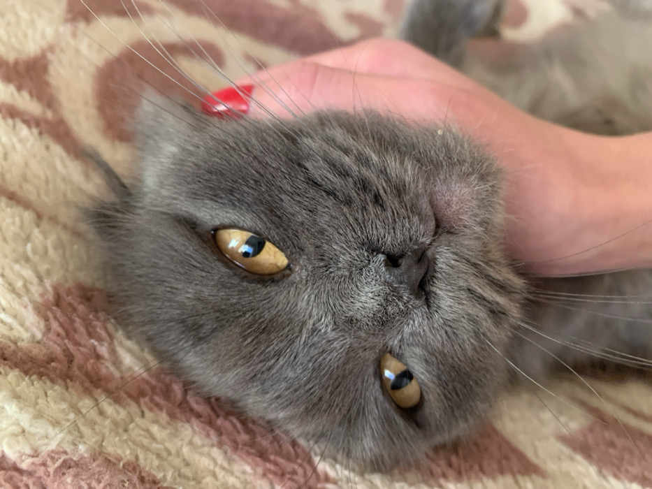 A close-up, overhead view depicts the head of a gray-furred cat, oriented horizontally, being gently held by a human hand
