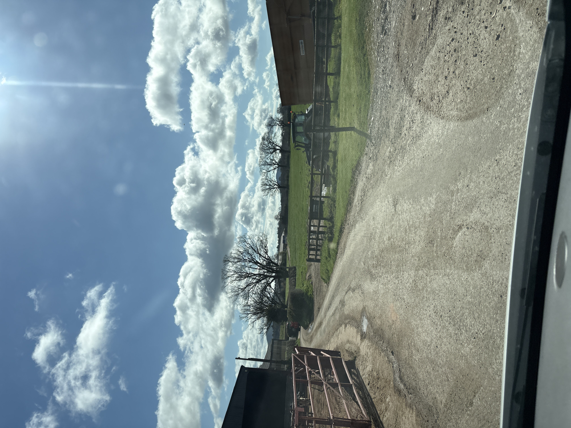 The image depicts a rural scene in Pulverbatch, United Kingdom. A dirt road runs through the frame, flanked by green fields and trees. A tractor is visible in the middle distance. The sky is blue with scattered white clouds. The image is likely taken from inside a vehicle, as part of the vehicle's interior is visible in the foreground.