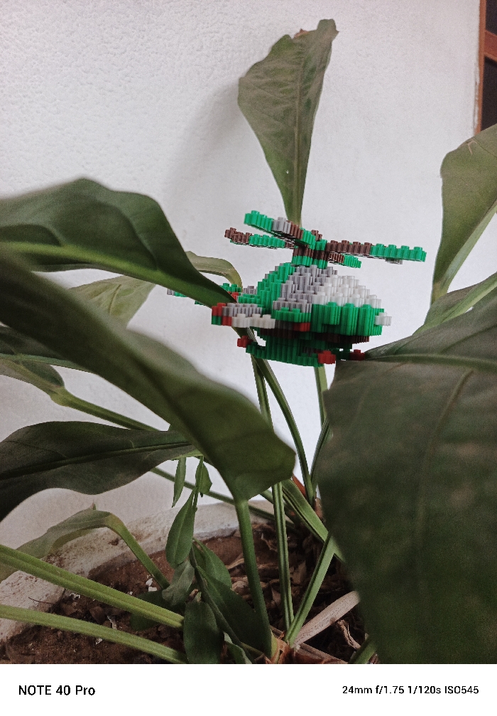 - "An indoor, static close-up photograph captures a miniature toy helicopter, assembled from interlocking plastic blocks, situated amidst the foliage of a potted plant" by FM-eI8CE3, licensed under CC BY 4.0