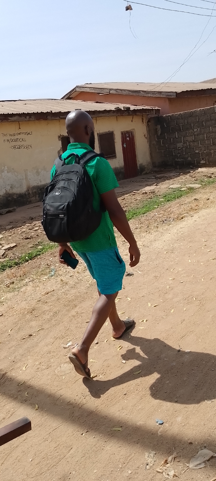 A male individual with dark skin, a bald head, and a beard is depicted walking on an unpaved dirt path in Narayi, Nigeria, from a rear-right perspective