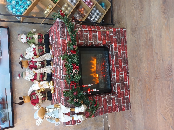 An interior image captures a festive holiday display, likely within a commercial retail space in Tbilisi, Georgia. A decorative fireplace, designed with a realistic red brick facade, occupies the center, featuring an electric insert that displays simulated burning logs and flames. A green pine garland, adorned with red berries and miniature red and white candy canes, is draped across the fireplace opening and mantel. Arranged on the mantelpiece are eight plush Christmas-themed figures: a light-colored moose with gold antlers and vest, an angel figure in white and gold, two Santa Claus figures in red and green plaid outfits, a brown reindeer figure in a matching plaid outfit, two gnome figures with tall pointed hats, and a snowman figure in a green plaid outfit. To the right of the fireplace, a multi-tiered shelving unit constructed from black metal and light wood is visible. This unit holds several clear plastic containers, which are filled with numerous spherical Christmas ornaments in various colors including blue, gold, silver, pink, and red. The background wall is textured in a light grey or beige hue, with a large, dark-framed object or screen positioned above the fireplace. The floor throughout the scene is covered with light brown wood laminate panels. No individuals or active interactions are present in the image.