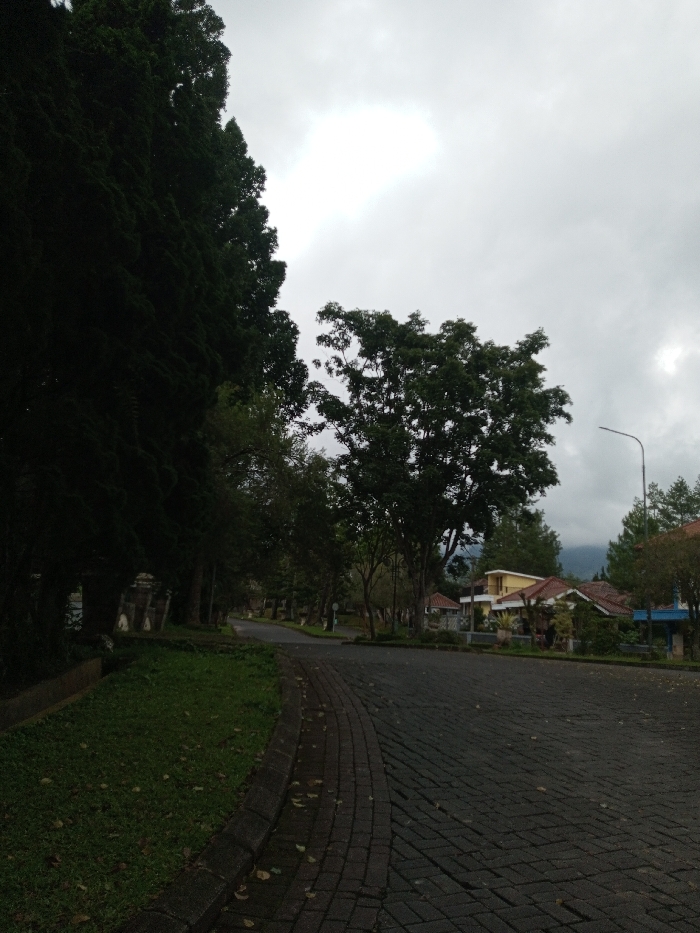A cobblestone road curves through a wooded area under a cloudy sky. Tall, dark trees line the left side, casting shadows on the grass. Buildings with terracotta roofs are visible on the right, interspersed with more trees and a streetlight. In the background, a mountain peak can be vaguely seen through the trees. The overall scene depicts a quiet, overcast day in a residential area surrounded by nature.