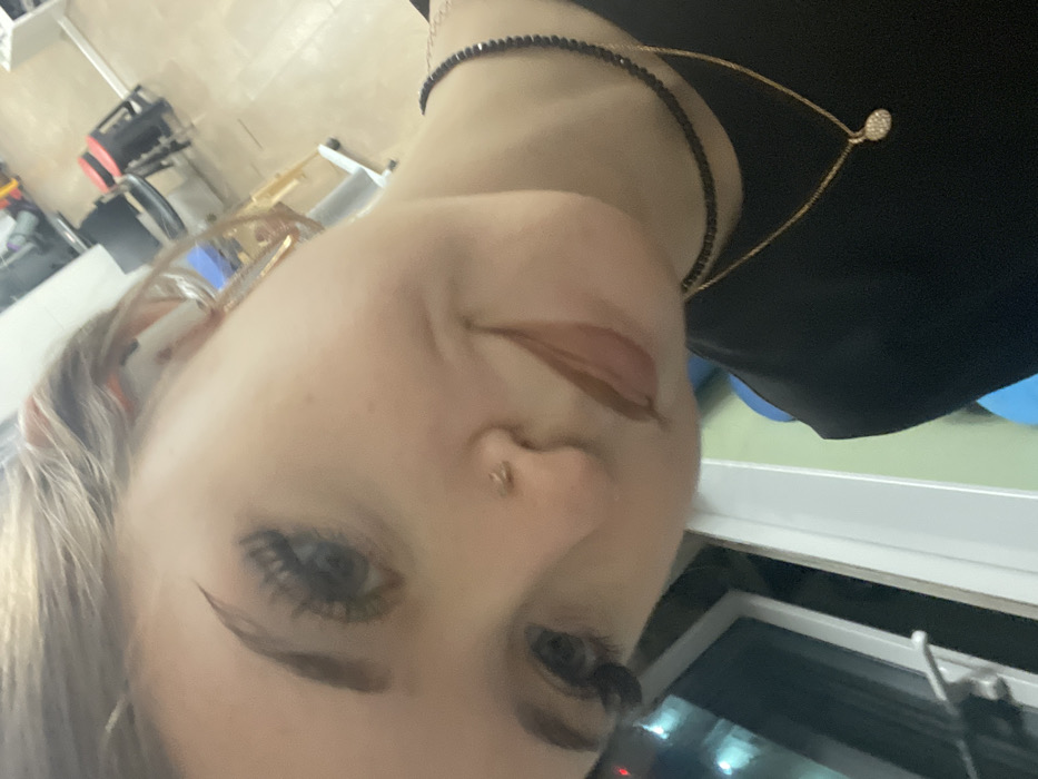 A close-up, slightly angled, portrait of a fair-skinned woman. She is wearing a black top, a black beaded choker, and a gold pendant necklace. A small gold stud adorns her nose. Her eyes are blue-gray with dark eyeliner and mascara. Light-colored hair is partially visible. The background includes a window frame and a blurred view of what appears to be a room with exercise equipment.