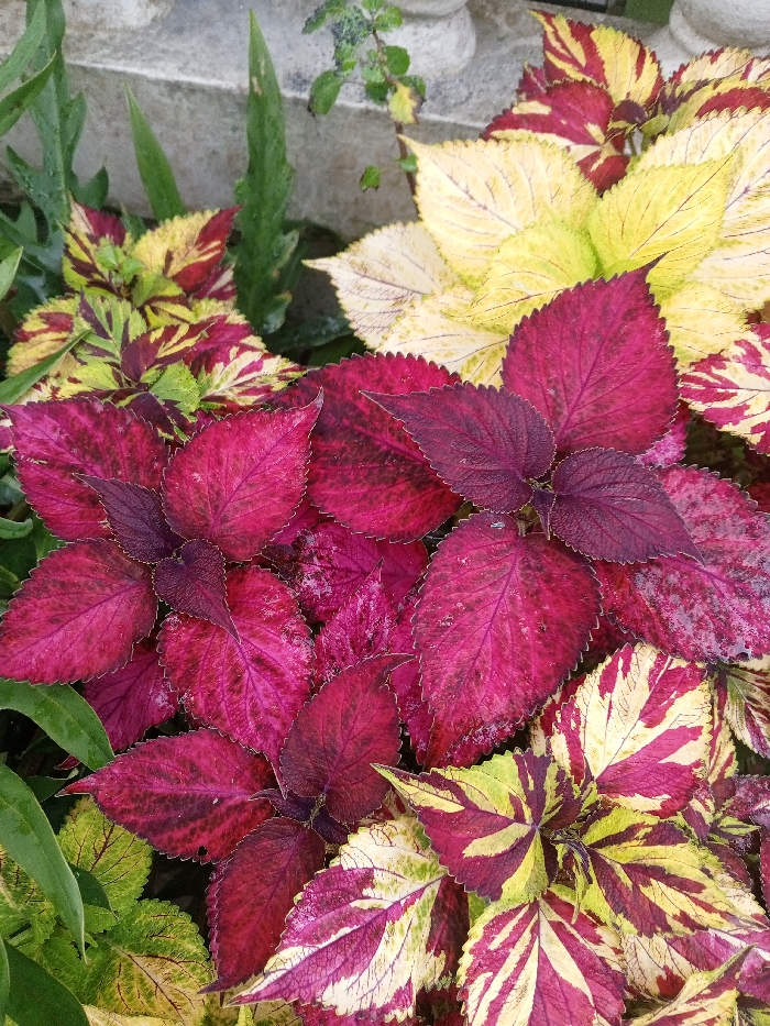 The scene, located in Khe Sanh Commune, Vietnam, captures a detailed, overhead view of variegated plant foliage. The primary subjects are numerous coleus (Plectranthus scutellarioides) plants, densely arranged. Their leaves display vibrant coloration, including deep magenta, fuchsia, bright yellow, and lime green, often in intricate, irregular patterns with distinct venation. Leaf margins are serrated. In the upper background, a partially visible, textured, light grey stone or concrete structure, consistent with a baluster or planter rim, is present. Out-of-focus green foliage occupies other background areas. No individuals, animals, or dynamic actions are depicted.