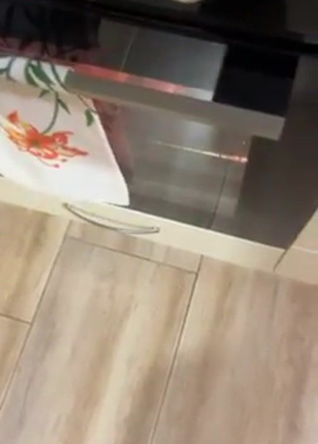 A medium shot shows a kitchen oven with light-colored wood-look flooring