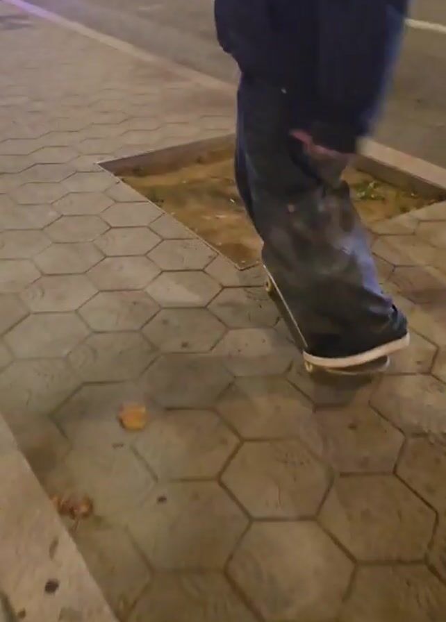 person in a dark jacket and jeans skateboarding on a paved sidewalk. The person is wearing black shoes with white trim. The sidewalk has a honeycomb pattern and some small patches of grass in recessed areas. In the background, there's a street with city lights and cars. The person pushes off with one foot to propel the skateboard forward.