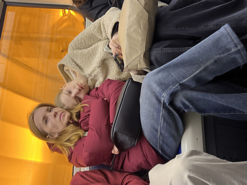Inside a subway car on the Saint Petersburg Metro, likely in the area of Shushary, Russia, two females are seated on a blue and white bench