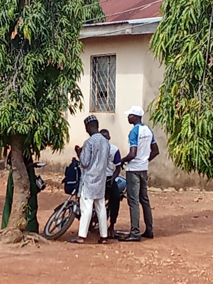 The image depicts three adult males standing on reddish-brown dirt ground, partially shaded by two large trees with dense green foliage. In the background, a light-colored, single-story building with one visible window protected by diagonal security bars and a reddish-brown corrugated metal roof is present. The man on the left, partially facing away, wears a patterned cap, a vertical striped light-colored long-sleeved tunic, and white pants with sandals. He holds a small, dark object in his hands, appearing to examine it. A silver-colored bicycle with a dark blue backpack attached to its frame leans against the trunk of the tree to his left. The central man is partially obscured by the man on the left. He wears a white short-sleeved shirt with blue accents on the shoulders and a dark lower garment. He appears to be observing the man on the left. The man on the right stands facing left, wearing a white baseball cap, a white short-sleeved polo shirt with blue shoulders and side panels (text, possibly "SUPER," is visible on the back), dark trousers, and dark shoes. He is looking towards the other two men. The men appear to be engaged in a stationary interaction or discussion. The ground is dry earth. The location is an unspecified city, Unknown, Unknown.