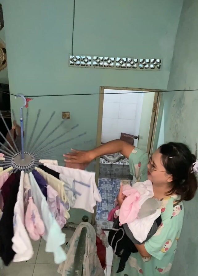A woman in glasses and a green patterned pajama set is holding a pile of clean baby clothes and taking down other baby clothes hanging on a circular drying rack in a stairwell painted light green. The drying rack is attached to the ceiling. Behind the woman is an open doorway to a bathroom with light-colored tile. There are small air vents in the wall behind her. The woman is standing on concrete stairs with a simple metal railing. She carefully removes the clothes from the drying rack, occasionally glancing at the baby clothes in her arms.